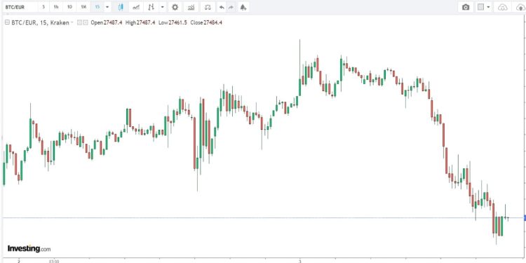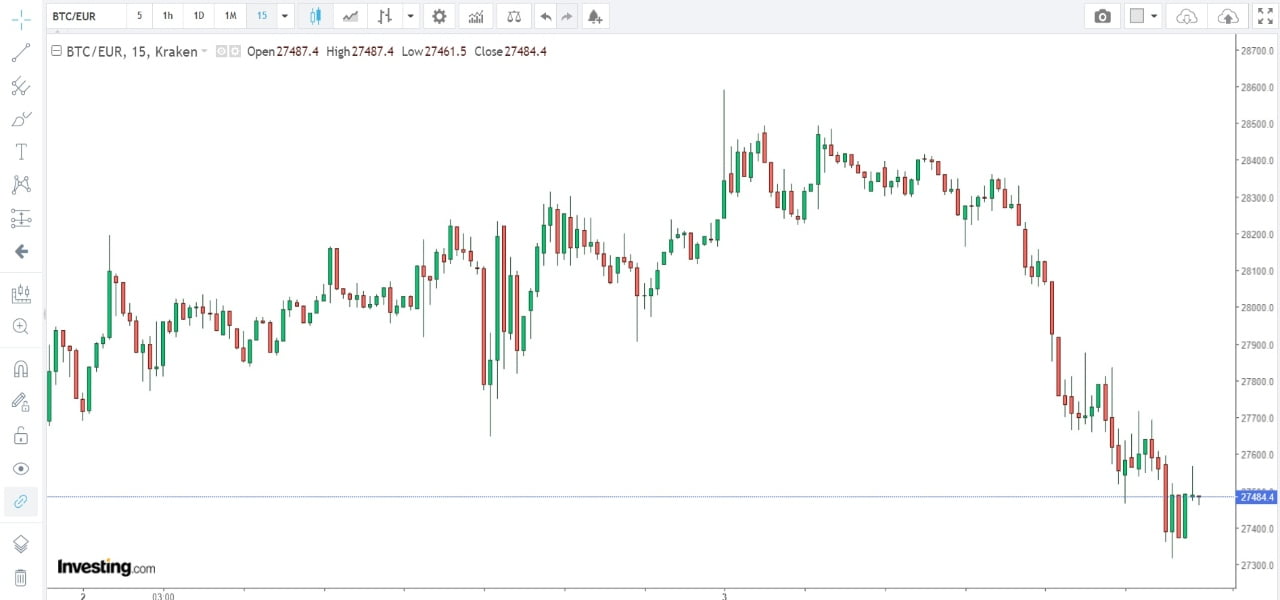 Il Bitcoin oggi ha avuto un ulteriore ribasso dopo l’apertura a 28241 euro a cui è seguita immediatamente una piccola correzione di prezzo fino al crollo definitivo cominciato alle ore 8 del mattino che ha portato lo scambio della criptovaluta nel mercato spot dell’Euro a toccare il minimo giornaliero di 27316 euro.