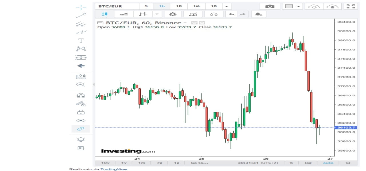 La colonna rossa prende velocità e spaventa i mercati delle criptovalute: dalle ore 14 di oggi infatti il Bitcoin, dopo il massimo dei 38060 è scivolato con ben quattro colonne rosse su timeframe orario, che portano il segno negativo. Complessivamente sono stati persi oltre 2000 euro in meno di 6 ore e la scivolata non accenna a diminuire.