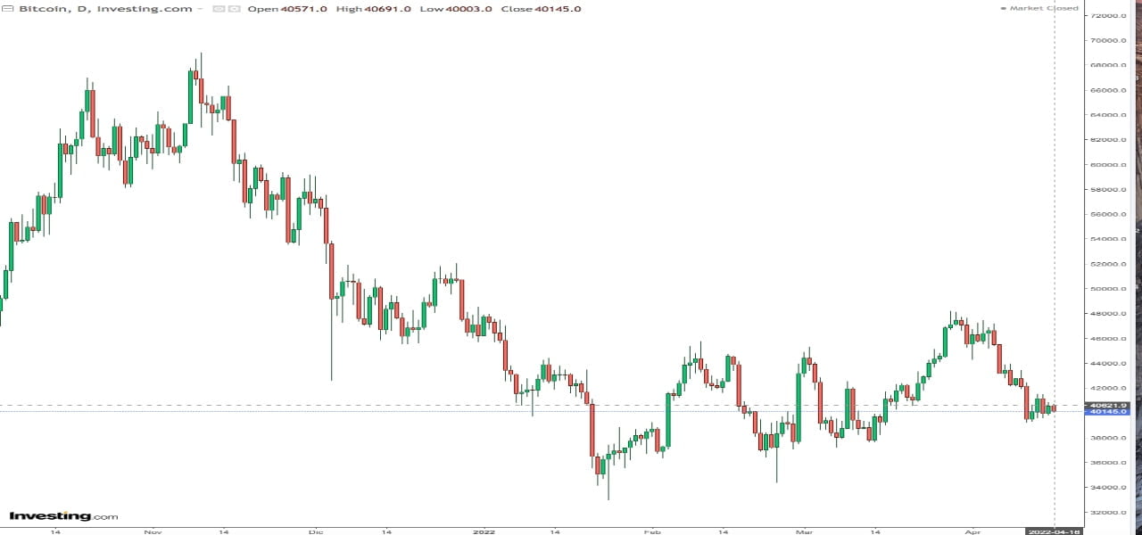 Criptovalute, il mercato di bitcoin si è contratto oggi 16 aprile 2022 ma difende quota 40, gli indicatori indicano un'inversione ribassista di breve termine per tutte le maggiori coin.
