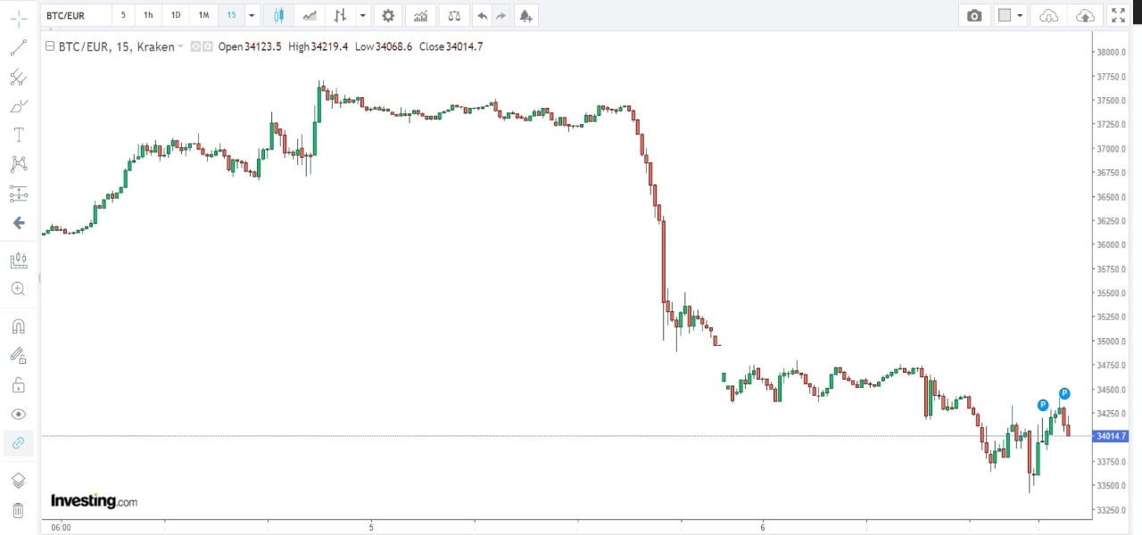 Il Bitcoin (BTC) oggi aperto a 34601 ben €1500 in meno rispetto alla giornata di ieri, che ha visto un precipizio dalle 15 fino alle 15 di oggi dove è stato toccato il minimo di €33411.