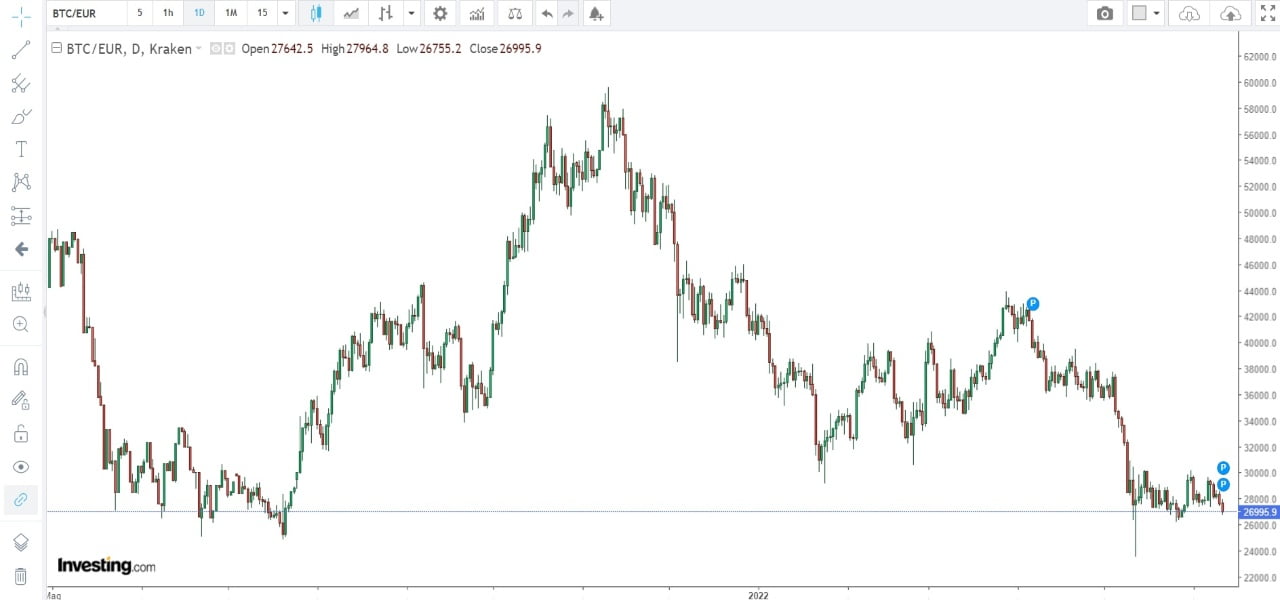 Il mercato delle criptovalute è in ribasso generale del 3,47%. Tutti i listini sono in rosso e il Bitcoin (BTC) oggi è quotato 27058 euro e ha subito una variazione giornaliera negativa del -1,85%, vedendo un decremento della sua capitalizzazione di mercato che è arrivata 515,5 miliardi di euro, il volume nelle 24 ore è di 25,4 miliardi di euro, con un aumento dello 0,25%. La variazione di prezzo nelle 24 ore è diminuita del -4,03% e quella settimanale del -5,1%.