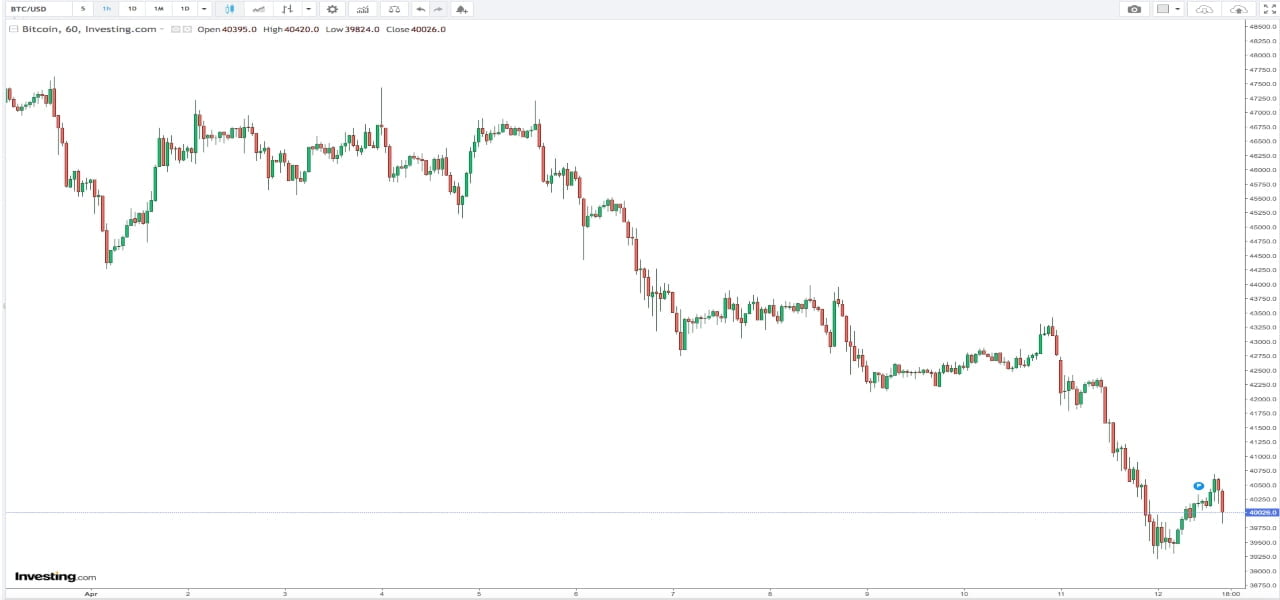 Bitcoin (Btc) oggi sosta in territorio 40.000 che segue al trend ribassista cominciato il 29 marzo 2022 quando lo scambio aveva toccato quota 48141 dollari.