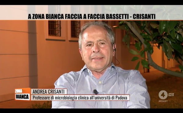 Andrea Crisanti, direttore di microbiologia dell'università di Padova, ospite in collegamento con Zona Bianca, su Rete 4: ecco cosa ha dichiarato