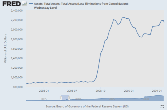 La Fed non interveniva perché vigeva (e vige ancora) il dogma del libero mercato, secondo il quale un’azienda (anche le banche sono aziende) deve essere in grado di stare sul mercato oppure, se non è all’altezza della situazione, è bene che fallisca. Quando, però, si sono accorti che vi sono banche troppo grosse, il cui fallimento avrebbe innescato una catena di fallimenti e il disastro sociale (oltre che finanziario), allora la Fed è intervenuta: dopo il fallimento della Lehmann nell’ottobre 2008 generò una montagna di liquidità per sostenere le banche in difficoltà. Questo portò a un’espansione del bilancio della banca centrale, che testimonia quanta liquidità abbia generato. Ecco il grafico del “total asset” della Fed nel 2008.