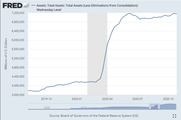 Il bilancio della Fed, che a forza di Qe era cresciuto fino a 3.900 miliardi a fine 2019, arriva di colpo a toccare i 7.200 miliardi nel luglio 2020.