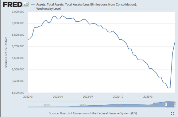 Nel 2020 la Fed, causa l’alta inflazione, ha aumentato i tassi e ha iniziato a togliere liquidità, fatto ben testimoniato dalla discesa del suo bilancio, da quota 9.000 miliardi fino a 8.300 circa ai primi di marzo 2023.