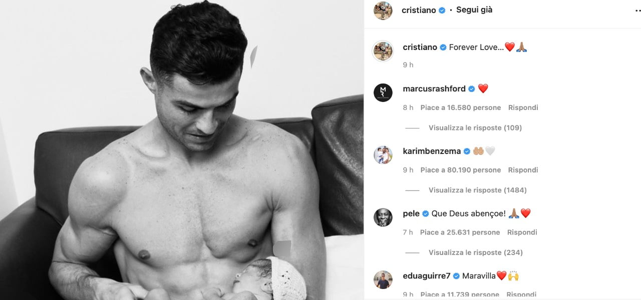 Tra i tanti commenti al post di Cristiano Ronaldo con la figlia c’è quello di Pelè: «Che Dio vi benedica». Ma ci sono anche quelli del suo museo a Funchal e dei compagni di squadra, non solo del Manchester United, ma anche dei club in cui ha giocato in passato, come Karim Benzema, Hugo Almeida e Marcus Rashford. Appena tornato in campo dopo la tragedia, Cristiano Ronaldo era subito andato in gol. In quell’occasione, però, non ha mostrato la sua proverbiale esultanza, ma ha rivolto lo sguardo al cielo con un dito per ricordare il figlio, la cui vita si è spenta ancor prima di vedere la luce.