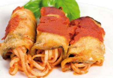 Ad esempio quella che chiamano pizza rustica di ‘Nzino fatta con semola di grano duro, vino rosso, olio extravergine, cipolle, cicorie, passata di pomodoro, peperoncini piccanti e alici sott’olio, oppure quegli involtini che compaiono sulla copertina del libro, assolutamente originali preparati con melanzane, bavettine, gavoi, parmigiano reggiano, basilico, olio e sugo di pomodoro.