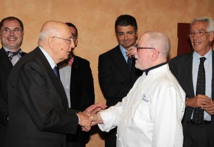 Nella foto, la storica visita del presidente Giorgio Napolitano al Vinitaly di tre anni fa, dopo il pranzo con lo chef Piero Bertinotti del Pinocchio di Borgomanero