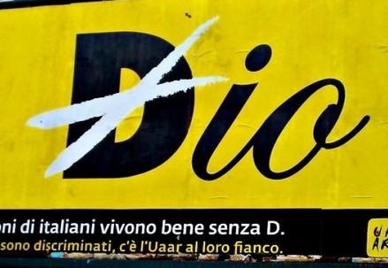A Bologna sono apparsi dieci cartelloni pubblicitari grandi sei metri per tre che raffigurano la parola “Dio” con una croce bianca sulla D maiuscola, in modo che resti solo l’“io”, in corsivo, su sfondo giallo. Sotto, in piccolo si aggiunge “Dieci milioni di italiani vivono bene senza D” e “quando sono discriminati, c’è l’Uaar al loro fianco” .