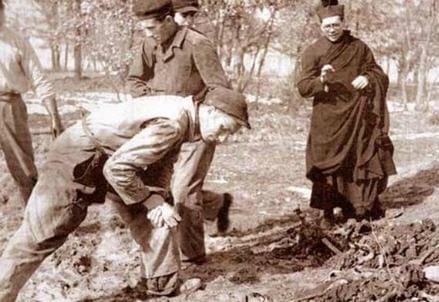 Un prete benedice i resti di vittime infoibate (Immagine dal web)