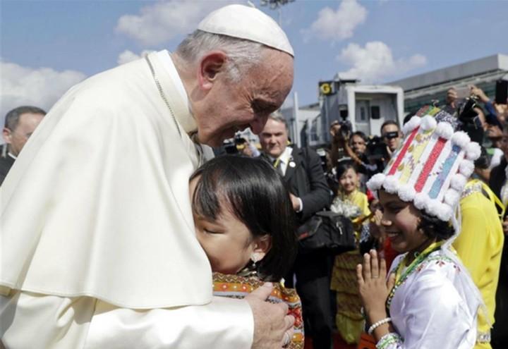 YANGON (Myanmar) — L’arrivo è caldissimo. 32 gradi dopo 10 ore di volo attraverso due continenti. Il Papa scende con cautela la scaletta ed è il primo pontefice a toccare il Myanmar. E subito capisci che è in formissima. Scherza con il cardinale Charles Maung Bo, arcivescovo di Yangon e con monsignor Angelo Becciu, sostituto per gli affari generali della Santa Sede che questa volta si è fatto trovare sotto la scaletta dell’aereo, a causa di un impegno in Malesia. Bergoglio parla in italiano mentre per i bambini che vestono abiti tradizionali, chiamati a raccontare in tutte le sfumature dell’arancio la diversità etnica del paese che lo accoglie, Francesco si affida al linguaggio dei gesti, decisamente a lui congeniale.