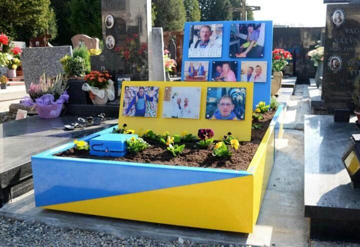 Hanno vissuto insieme 36 anni, sono stati tra i primi attivisti italiani a impegnarsi per il riconoscimento dei matrimoni fra persone del loro sesso, ma ai loro tempi per sposarsi dovettero andare in Inghilterra. Poi quando il riconoscimento è passato anche in Italia si sono uniti ufficialmente nel comune di Mariano Comense dove vivevano. Uno di loro, Carlo Annoni, 61 anni, è morto qualche mese fa. Corrado Spanger, il suo compagno, ha voluto ricordarlo in un modo molto appariscente, facendo costruire una tomba nel locale cimitero che è un autentico pugno nell’occhio. Sembra una costruzione del Lego, colori fosforescenti dal blu elettrico al giallo, la forma è una sorta di grossa vasca riempita di terra su cui crescono dei fiori e sopra due grossi pannelli degli stessi colori contenenti le foto dello scomparso. Impossibile non notarla in mezzo alle altre tombe di severo marmo grigio o nero.