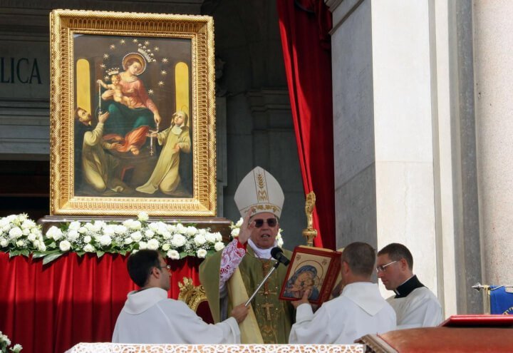 Come ogni festa della Madonna del Rosario, anche oggi si celebra a Pompei la celebre Supplica alla Madonna Vergine del Rosario: tradizionale nella prima domenica d’ottobre (e ogni 8 maggio), la festa vede l’arrivo di migliaia di fedeli ai piedi del Vesuvio. La tradizione della Supplica è storica e nasce addirittura dal beato Bartolo Longo che introdusse il culto del 1883: cercava di risolvere gli animi delle sofferenze e dei problemi quotidiani della gente povera di quel tempo. Due volte l’anno, oggi 8 maggio giorno in cui ebbe inizio la costruzione della basilica di Pompei e la prima domenica di ottobre i fedeli ricordano la Madonna di Pompei. Negli anni seguenti al Concilio Vaticano II si è rivisto il testo e sono stati eliminati gli accenti più sinceri della spiritualità del beato Bartolo Longo: ecco un breve estratto che richiama al valore della misericordia per un popolo di umani peccatori che si rivolgono a Dio, «siamo meritevoli dei più aspri castighi, * ma Tu ricordati * che, sul Golgota, * raccogliesti, col Sangue divino, * il testamento del Redentore moribondo, * che ti dichiarava Madre nostra, * Madre dei peccatori. Tu dunque, * come Madre nostra, * sei la nostra Avvocata, * la nostra speranza. * E noi, gementi, * stendiamo a te le mani supplichevoli, * gridando: Misericordia!».