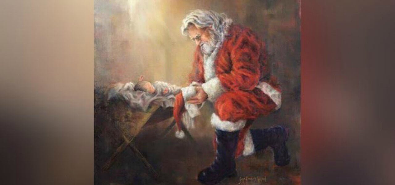 Immaginetta di Babbo Natale inginocchiato davanti a Gesù Bambino crea scandalo fra i cristiani fondamentalisti