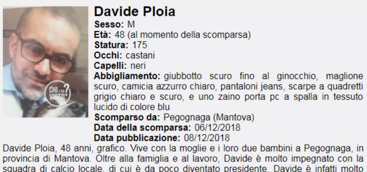 Per chiarire una volta di più la gravità della situazione relativa alla scomparsa di Davide Ploia da Pegognaga è intervenuta nel corso dell’edizione delle 11:30 di Chi l’ha visto? in onda su Rai Tre la moglie del 48enne. La donna, evidentemente provata dalla sparizione del marito, ha detto:”Davide si è allontanato il 6 dicembre: la mattina ha accompagnato la bambina a scuola e da lì sappiamo solo di una telefonata ad un amico che si occupa di calcio insieme a lui“. La moglie di Davide Ploia ha parlato di alcuni avvistamenti a Pegognaga e a Cervia, risalenti agli ultimi due giorni, aggiungendo che l’uomo si trova “in uno stato di difficoltà“. La donna ha rivolto un appello direttamente al marito, scoppiando il lacrime:”Ci manchi tantissimo, vorremmo presto riabbracciarti, ti stiamo pensando immensamente. Caterina (la figlia, ndr) dice che forse non ritrovi la strada. Ti vogliamo tutti bene, se senti questo messaggio scrivi o chiamaci“.