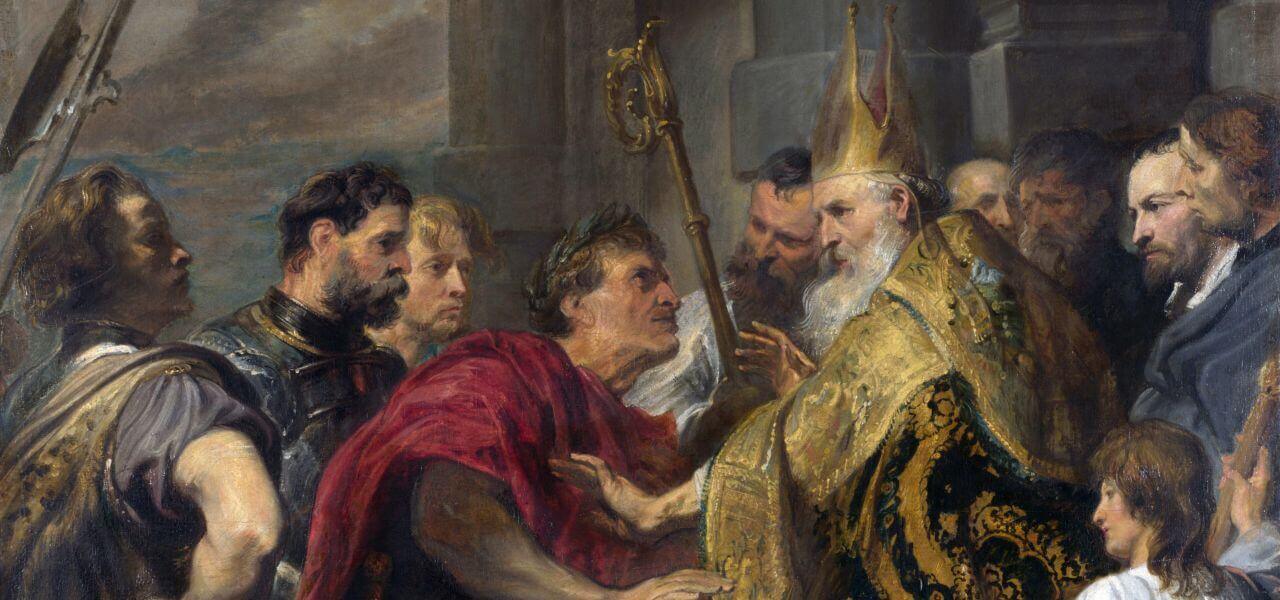 Sant'Ambrogio rifiuta l'ingresso in chiesa all'imperatore, nel dipinto di Van Dyck (Wikipedia)