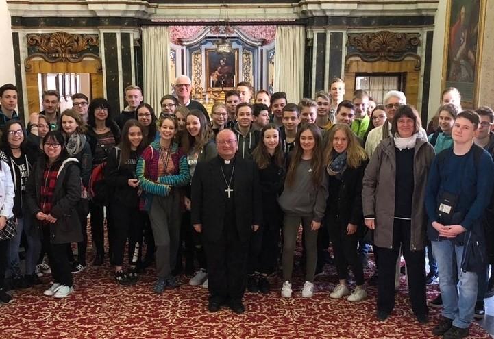 In primo luogo si è trattato di un gesto pedagogico e non giornalistico, quindi non ho la pretesa di riprendere parola per parola ciò che ha detto Scicluna, ma di restituire il senso dell’incontro, aperto da una domanda dell’arcivescovo: “Chi siete?”. Una nostra ragazza, Henrike, aveva preparato una breve discorso in cui ha spiegato le linee fondamentali della nostra scuola ed ha ricordato un’incontro internazionale svoltosi la settimana scorsa nell’ambito di un progetto di Erasmus Plus, che porta il titolo di “Tragedia e speranza” e che vede coinvolte tre scuole, una francese, una polacca e la nostra tedesca.