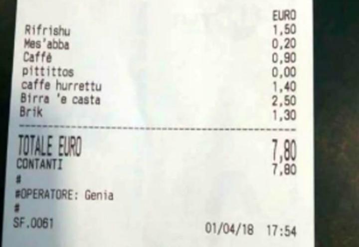 Sta facendo il giro del web la foto di uno scontrino di un bar, il Genia di Oliena in provincia di Nuoro, postata da un cliente. Lo scontrino infatti è stampato in dialetto sardo, anzi no attenzione se no la titolare si infuria: in lingua olianese, quella di Oliena. E’ da anni infatti che la titolare, Eugenia Vacca, una donna di 34 anni, fa così: batte scontrini in dialetto e si rivolge ai clienti solo in dialetto. Come si legge in una agenzia dell’Ansa “l’aperitivo diventa “Rifrishu”, gli snack “Pittitos”, la birra di marca “Birra ‘e casta”. E a chiusura della ricevuta fiscale appare il saluto “a mengius viere in salude” che sostituisce il “grazie e arrivederci”. Peggio dei cartelli stradali in lingua tedesca in provincia di Bolzano.