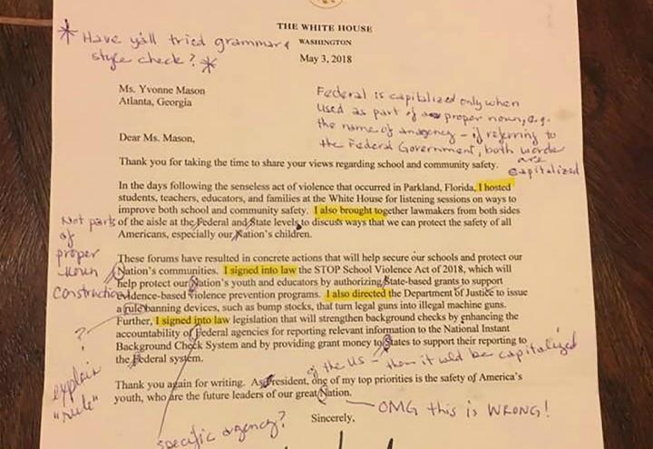 Non capita spesso che un capo di stato veda restituirsi una sua lettera autografa piena di segnalazioni di errori di grammatica. Ma con Donald Trump, si sa, può succedere di tutto. E’ un po’ come quando parla Luigi Di Maio che sbaglia continuamente i congiuntivi, purtroppo l’educazione scolastica è ormai cosa d’altri tempi. Ma la signora Yvonne Mason, professoressa americana in pensione, alla buona scrittura ci tiene molto, come si è capito. Aveva infatti scritto una lettera a Donald Trump sui casi incresciosi delle stragi nelle scuole del loro paese, per invitarlo a prendere misure adeguate contro la vendita di armi da fuoco, in particolare chiedendo a Trump di visitare personalmente ognuna delle famiglie che aveva avuto una vittima nella strage di Parkland dello scorso febbraio, e probabilmente pensava che nessuno le avrebbe mai risposto. Invece è arrivata a casa sua una lettera intestata alla Casa Bianca, scritta al computer e con la firma autografa di Donald Trump.
