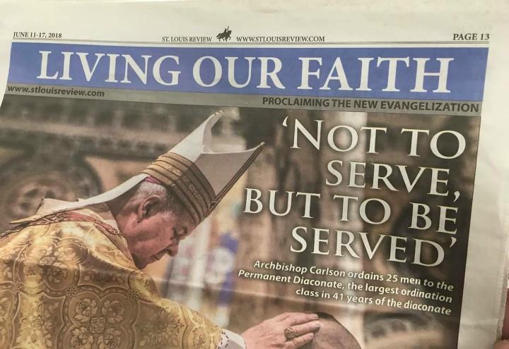 Freud sarebbe impazzito se si fosse trovato davanti un caso del genere, niente di meglio per dare ragione alle sue teorie psicanalitiche. Freud è morto da moltissimo, ma evidentemente i suoi studi si applicano ancora oggi alla perfezione, per quanto riguarda quantomeno l’espressione, cioè dire l’opposto di quello che si intendeva, in questo modo, sosteneva lo studioso, riveliamo quello che veramente pensiamo. Ecco di cosa si tratta. Nei giorni scorsi l’arcivescovo Robert James Carlson di St. Louis negli Stati Uniti, ha ordinato 25 nuovi diaconi permanenti, l’ordinazione diocesana di maggior numero degli ultimi quarant’anni. Un evento dunque, che giustamente va sottolineato e celebrato. Così il giornale ufficiale dell’arcidiocesi ha pensato bene di metterlo in prima pagina sparando il classico titolone che deve restare impresso: “Non servire, ma essere serviti”, “Not to serve, but to be served” si legge sul giornale.