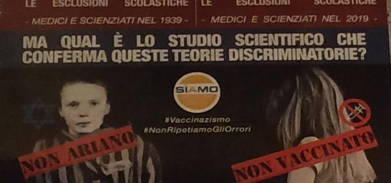 Viene da Trento l’ultima follia No Vax con una campagna pubblicitaria di alcuni gruppi di anti-vaccini che arrivano a paragonare l’esclusione dei bambini dalle scuole addirittura con la Shoah e le leggi razziali durante il periodo nazifascista. Secondo il gruppo SiAmo, che da tempo persegue la campagna di attacco e polemica contro le scelte del Ministero Salute e dello Stato Centrale in merito al tema sempre più delicato dei vaccini. A Trento in questi giorni si è assistito a cartelli come quello in foto “La storia si ripete”, dove si paragonano alcuni “scritti” (riadattati però dai No Vax) del 1939 con quanto avviene oggi nel 2019. «La teoria della superiorità della razza ariana giustifica le esclusioni scolastiche» (Medici e scienziati nel ’39) e poi subito di fianco «la teoria dell’immunità di gregge vaccinale umana giustizia le esclusioni scolastiche», riferita alla comunità scientifica del giorno d’oggi. Sotto la domanda choc, «ma qual’è lo studio scientifico che conferma queste teorie discriminatorie?» con in foto un bimbo ebreo con la giubbina dei lager e la scritta “non ariano” di fianco ad una bimba odierna con scritto “non vaccinata”.