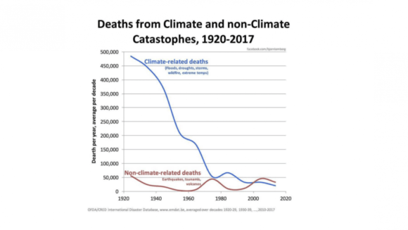 Lo studio ci parla, a partire dal 2000, di qualcosa come 2 milioni di miglia quadrate in più di vegetazione e aree verdi al mondo su base annua, ovvero piante e alberi che in totale rappresentano due volte e mezza la superficie continentale degli Stati Uniti. Capito perché la carestia di massa preconizzata dai fondatori dell’Earth Day non è mai avvenuta e mai avverrà, grazie a Dio? Per finire, poi, il mio grafico preferito. Questo qui, il quale ci mostra che, in palese contrasto con la narrativa ambientalista e su dati ufficiali dell’International Disaster Database, le morti dovute a eventi climatici a livello globale sono drasticamente calate negli ultimi 70 anni.