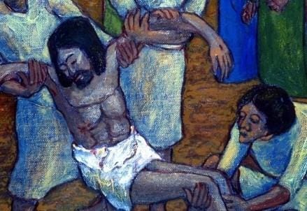 Il corpo del Cristo calato tra le loro braccia: Giuseppe si sporge, lo tocca.