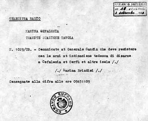 L’ordine impartito al generale Gandin dal Comando Supremo l’11 settembre 1943, alle ore 9,45