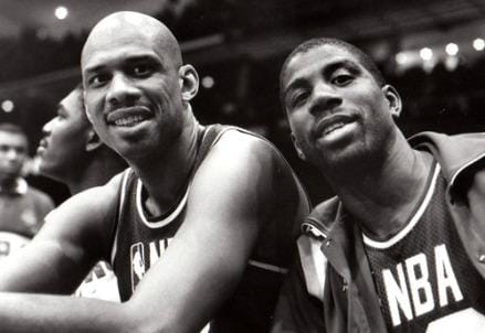 Kareem Abdul Jabbar (S) con Magic Johnson (Immagine dal web)
