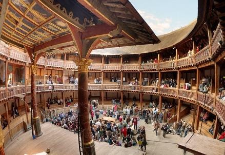 Una struttura circolare di legno, con un cortile interno per i posti in piedi, tre gallerie per i posti a sedere, una piattaforma in parte coperta, il tutto collocato in una zona periferica, la South Bank, raggiungibile per lo più solo remando across or along the Thames, attori solo maschili (per commedie d’amore e tragedie di stato in egual misura), trombe come accompagnamento musicale costante (e praticamente unico), scenografie per lo più assenti, un giovanotto della provincia, mai sedutosi sui banchi di Oxford e Cambridge, a redigere a ritmi sostenuti le opere che dovevano convincere il pubblico eterogeneo della Londra di fine Cinquecento/inizio Seicento; ma anche vincere la concorrenza decisamente agguerrita di altri teatri pubblici ed anche privati, e anche (se possibile) guadagnarsi il favore reale, ed ovviamente senza alcuna sovvenzione statale, queste le premesse per il più grande show business e la più affascinante esperienza di bellezza che il teatro abbia finora (non disperiamo della fantasia di Dio, se ci servisse un altro Shakespeare ce lo manderà) mai conosciuto, al punto che Harold Bloom, critico letterario dalle intuizioni folgoranti e sempre discutibili, definì il Bard “l’inventore dell’umano”.