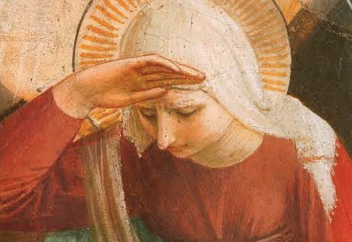 Beato Angelico raffigura Maria di Magdala che si copre il volto davanti al sepolcro vuoto. Ha capito che il Signore ha vinto