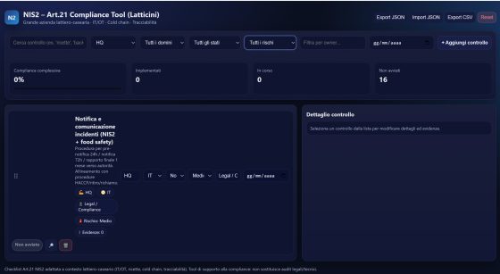Per questo i controlli di sicurezza vanno focalizzati in chiave di prodotto, includendo sicurezza degli impianti, accesso remoto di produttori e manutentori, protezione dei dati e delle ricette, continuità operativa legata agli stabilimenti e alla logistica refrigerata. Nella Figura 1 è mostrato un esempio di cruscotto tailor-made per l’azienda del settore lattiero-caseario per la conformità Art.21 NIS2.