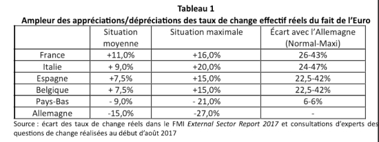 L’introduzione dell’euro ha portato a un apprezzamento dell’economia francese rispetto a quella tedesca compreso tra il 20% e il 40%, il che implica una notevole perdita di competitività. Le pubblicazioni annuali del “Rapporto sul Settore Esterno” del FMI per il periodo 2010-2019 dimostrano chiaramente questo effetto dinamico e il mantenimento di una disuguaglianza statica. Il tasso di cambio effettivo reale (REER) della Germania è sottovalutato del 10-15% rispetto al suo valore di equilibrio, mentre quello della Francia è sopravvalutato del 12-15%. Il divario è quindi in media di almeno il 25% a svantaggio della Francia. Possiamo anche osservare che la Francia non è l’unica in questa situazione. Spagna, Italia e Belgio si trovano in situazioni simili, come si può vedere in questa tabella del 2017.