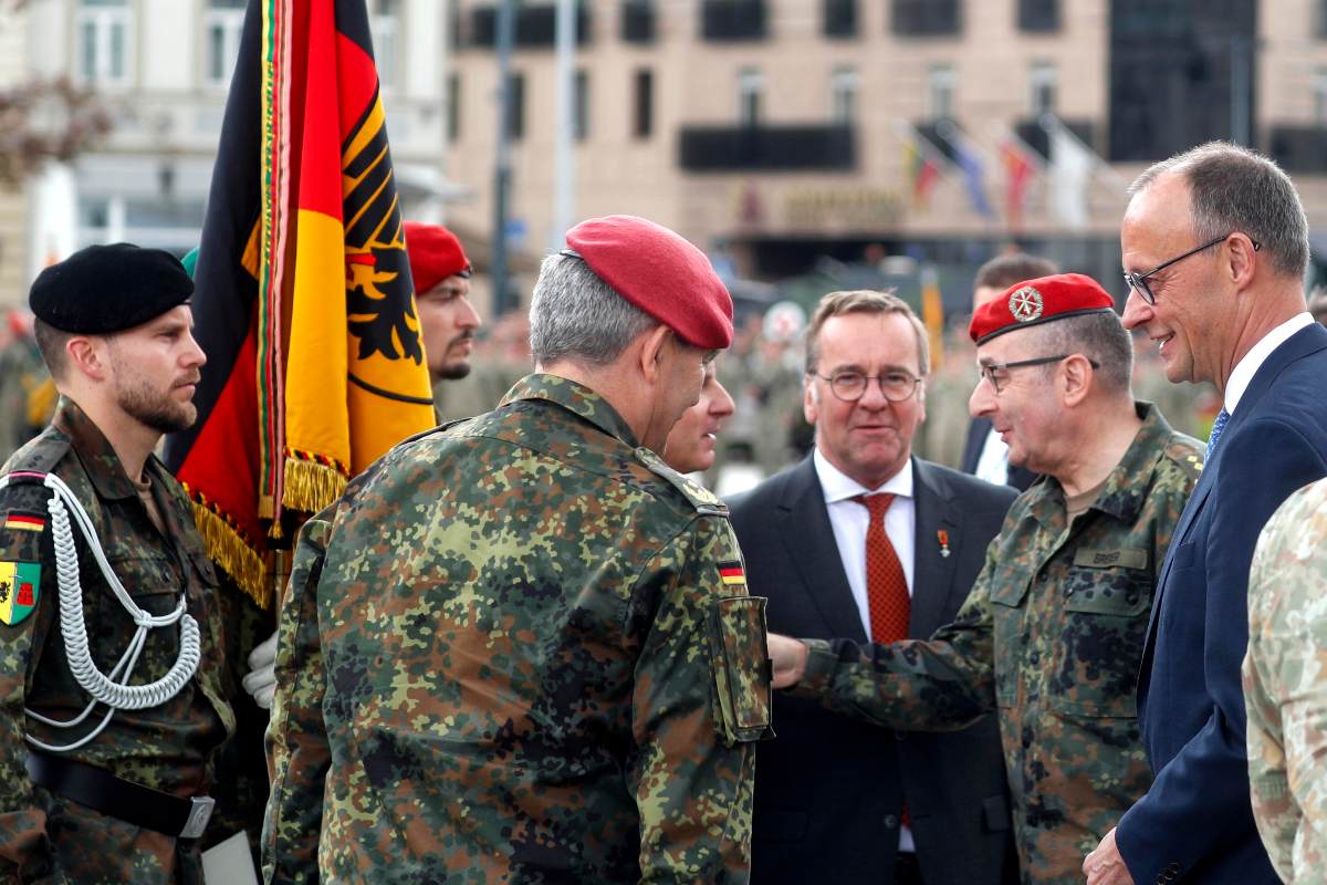il ministro della Difesa tedesca Boris Pistorius (c) e il cancelliere F. Merz inaugurano la 45a Brigata Corazzata tedesca "Lituania" a Vilnius, Lituania, 22 maggio 2025 (Ansa)