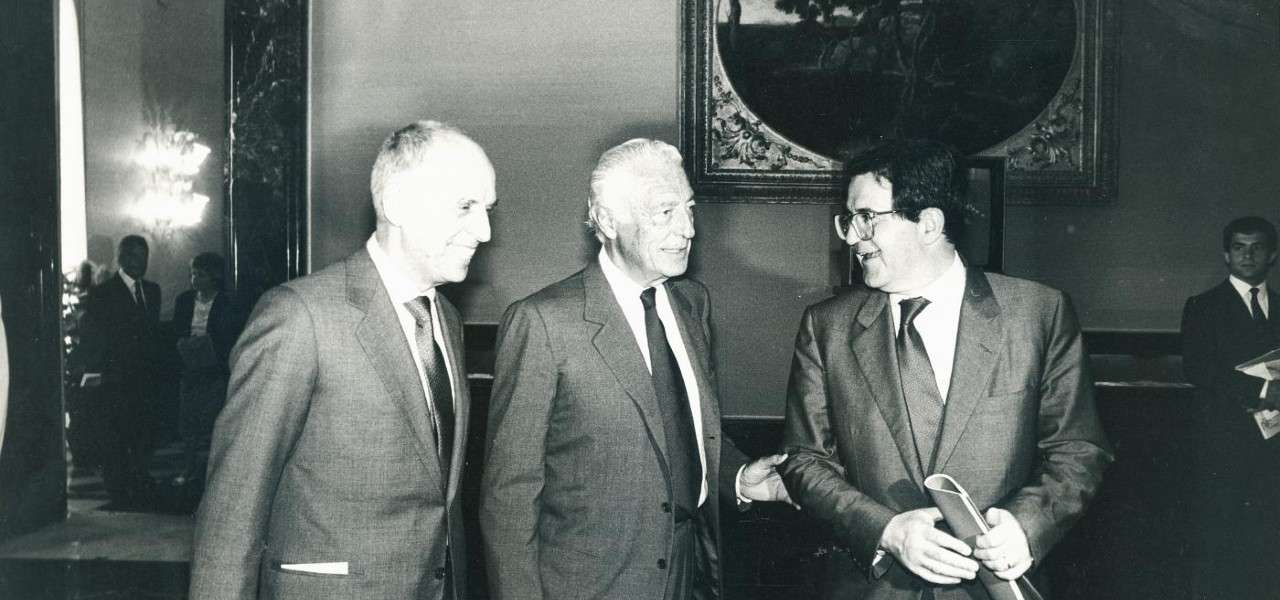In Montedison negli anni ruggenti: da sin., Mario Schimberni, Gianni Agnelli e Romano prodi (LaPresse)