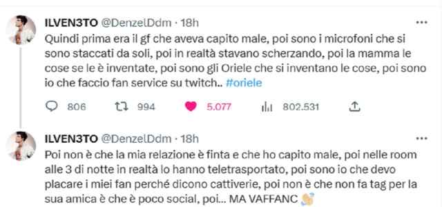 “Quindi prima era il gf che aveva capito male, poi sono i microfoni che si sono staccati da soli, poi in realtà stavano scherzando, poi la mamma le cose se le è inventate, poi sono gli Oriele che si inventano le cose, poi sono io che faccio fan service su twitch“. E’ questo il primo tweet con cui Daniele Dal Moro si è scagliato contro Tavassi che, finora, non ha replicato al veneto.