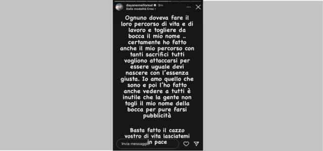 Duro sfogo di Dayane Mello su Instagram. La modella brasiliana, tra le storie del suo profilo, ha pubblicato un lungo post che, in poco tempo, è diventato virale e che i fan hanno interpretato come uno sfogo contro Dana Saber, concorrente del Grande Fratello Vip 2022 e che si è presentata come una vecchia conoscenza della stessa Dayane che ha fatto sapere di “aver fatto una grande pulizia sulle amicizie nella sua vita”. Nessun riferimento diretto a Dana Saber che, tuttavia, sembra essere proprio la destinaria dello sfogo della Mello.