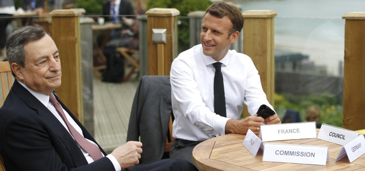 Mario Draghi e Emmanuel Macron al G7 in Cornovaglia (LaPresse, 2021)