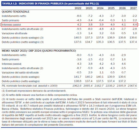 Assodato che di debito si sta parlando e che certamente se ne parlerà ancora è, inoltre, doveroso portare all’attenzione di tutti le prime e più correlate conseguenze di tale situazione. Mano al Def 2024, sfogliando le numerose pagine, si giunge al Focus “Spesa per interessi e sensitività ai tassi di interesse“: «La spesa per interessi di tutte le Amministrazioni Pubbliche (AP) calcolata in base al criterio di competenza economica secondo il SEC 2010, di cui gli interessi passivi sui titoli di Stato rappresentano più dell’88,0 per cento, nel 2023 è stata pari a circa 79 miliardi, in riduzione di circa 4 miliardi rispetto al dato registrato nel 2022; il costo medio del debito è passato dal 3,09 per cento del 2022 al 2,85 per cento del 2023. In termini di percentuale sul PIL la spesa per interessi delle AP è risultata pari al 3,8 per cento nel 2023, scendendo dal 4,2 per cento del 2022. Invece, il costo medio all’emissione dei titoli di Stato è cresciuto dall’1,7 per cento del 2022 al 3,8 per cento del 2023, risentendo dei marcati rialzi nei tassi di riferimento della politica monetaria».