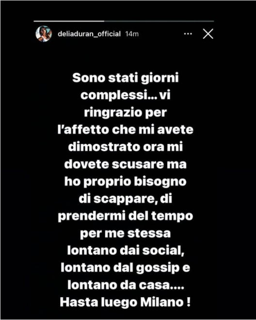 A chiarire questo gesto ora arriva proprio la bella venezuelana con un post piuttosto forte, in cui annuncia la volontà di scappare e allontanarsi da questo turbinio di cose che la stanno inondando in queste settimane. “Sono stati giorni complessi…” annuncia Delia in una story pubblicata su Instagram, in cui spiega quali sono ad oggi i suoi sentimenti.