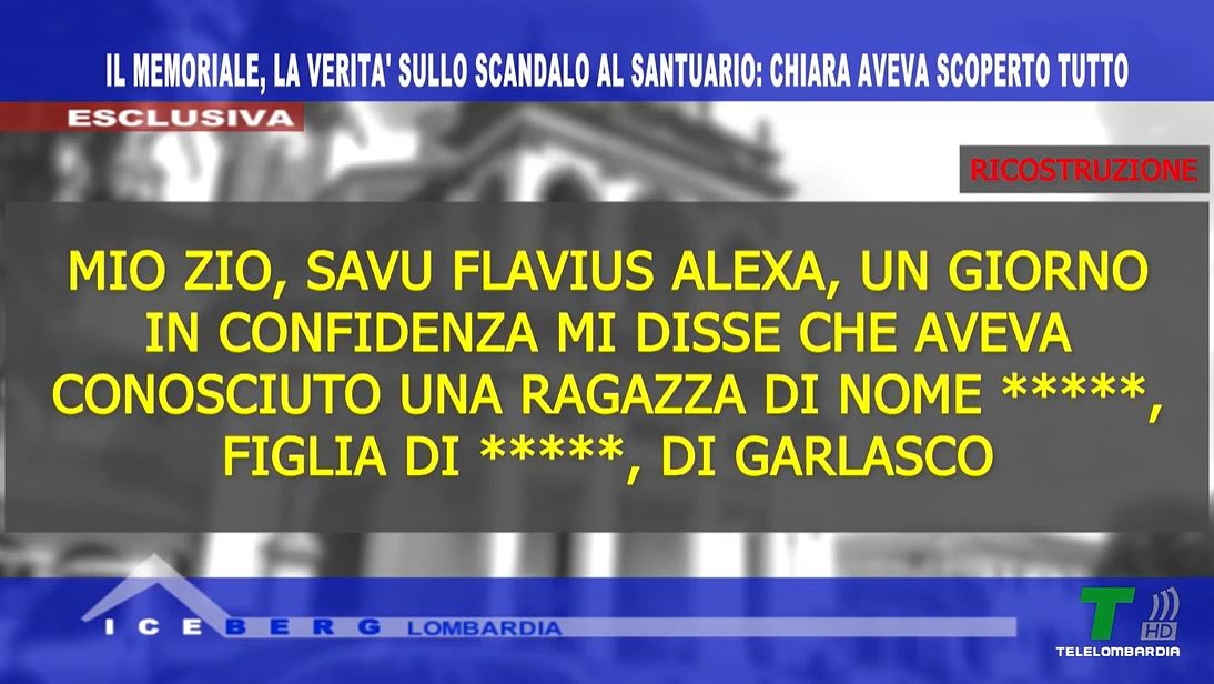 Cosa c’è scritto? Alessandro Boldrini, inviato di Iceberg, spiega: “Savu si confida con il nipote, siamo riusciti a raggiungere questo nipote che ha raccolto i suoi racconti prima che se ne andasse dall’Italia e li ha messi per iscritto. L’omicidio di Chiara Poggi? Lui ricalca le dichiarazioni di Savu, riferisce quello che gli dice lo zio e dice che bisogna guardare ciò che avveniva nel santuario, nel mondo della Chiesa anche ad alti livelli, cercare la pista e il movente nel mondo ecclesiastico. Chiara Poggi sarebbe stata uccisa per qualcosa legata al santuario”.