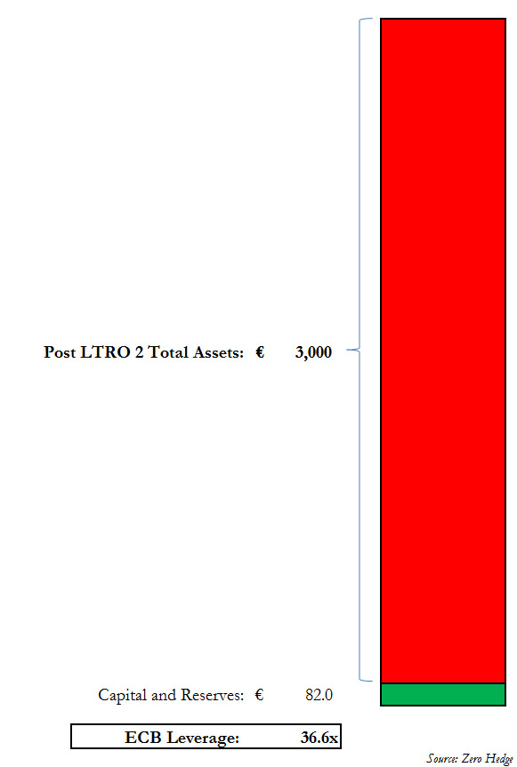 P.S. A proposito di Europa, ecco una chicca. Il grafico qui in basso mette a confronto gli asset totali della Bce al netto dell’asta Ltro di mercoledì (colonna rossa) e capitale e riserve (colonna verde): 3000 miliardi contro 82, ovvero un’esposizione alla leva pari a 36,6 a 1. Ecco cos’è la Bce, l’hedge fund peggio capitalizzato del mondo. Peccato che le abbiamo delegato la salvezza dell’eurozona…