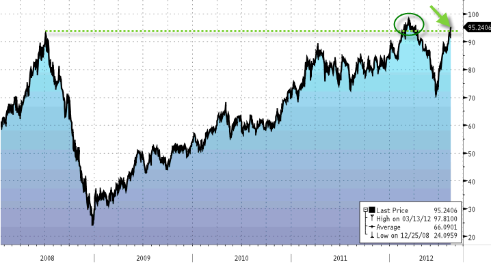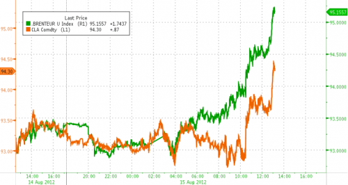 Ora, al netto del voler credere alla buona fede di Silverstein, un dossier del genere lo può preparare qualsiasi esperto militare, l’ottimo e nostrano Gianandrea Gaiani potrebbe fare anche di meglio. E, guarda caso, in contemporanea con lo scoop dell’Assange di Israele, ecco che la Reuters rende noto come l’ambasciata dell’Arabia Saudita in Libano abbia ordinato, tramite un sms e senza alcuna ragione specifica, ai suoi connazionali di lasciare immediatamente il Paese. Insomma, altro panico, altra instabilità nell’area. E cosa è successo mercoledì a New York in contemporanea con la pubblicazione di queste notizie. Come vedete nei due grafici più in basso: Brent in euro e Wti in dollari al picco delle contrattazioni intraday, con il Brent denominato in euro oltre i massimi del 2008 e in approccio ai massimi assoluti. Che meraviglia di disinformazione, anzi l’informazione manipolata: d’altronde, Gordon Gekko ne fece un totem già negli anni Ottanta.