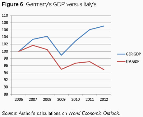 La Fed, a tutt’oggi, sembra non voler cambiare opinione, anche se le voci dissonanti verso questa continua politica di stimolo (85 miliardi di dollari di acquisti obbligazionari al mese) e tassi bassi (almeno fino al 2014) cominciano a farsi sentire, ma la Bce cosa pensa di fare? Io ho la netta impressione che il referendum sulla permanenza nell’Ue della Gran Bretagna annunciato mercoledì dal premier britannico, David Cameron e da tenersi dopo le politiche del 2015, non si farà mai. E non per paura o perché il premier tenda a rimangiarsi la parola, ma perché per allora, probabilmente, l’Ue come la conosciamo oggi non esisterà più. Il disallineamento tra blocco core o Nord e il cosiddetto Club Med continua ad ampliarsi, con il primo che nell’ultimo trimestre del 2012 ha conosciuto un primo accenno di recessione, mentre il secondo è ormai sprofondato nella deflazione più nera. Date un’occhiata al grafico qui in basso, che mette in correlazione il Pil tedesco e quello italiano: dal 2006 a oggi le due economie hanno conosciuto una divaricazione del 14% come Pil e questo trend pare destinato a crescere ancora.
