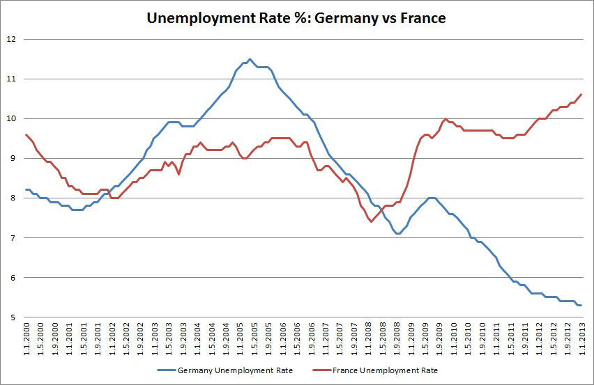 P.S.: In compenso, il resto dell’Europa gode di ottima salute. Nel giorno in cui la Bce manteneva invariati i tassi di riferimento e Mario Draghi diceva che «i mercati sono meno spaventati dell’esito del voto in Italia dei politici», ecco che dalla Francia arriva una notizia ben augurante. Il tasso di disoccupazione è infatti salito per il sesto trimestre consecutivo raggiungendo il 10,6%, il peggior dato dal secondo trimestre del 1999. Ecco qui un bel raffronto grafico. Ma non solo la Francia continua a sprofondare nella recessione, anche la Germania, visto che il dato degli ordinativi industriali di gennaio ha segnato un bel -1,9% mese su mese, contro una previsione del +0,6%, già rivista al ribasso dall’1,1% di dicembre. E vai con l’austerity, che si va bene!