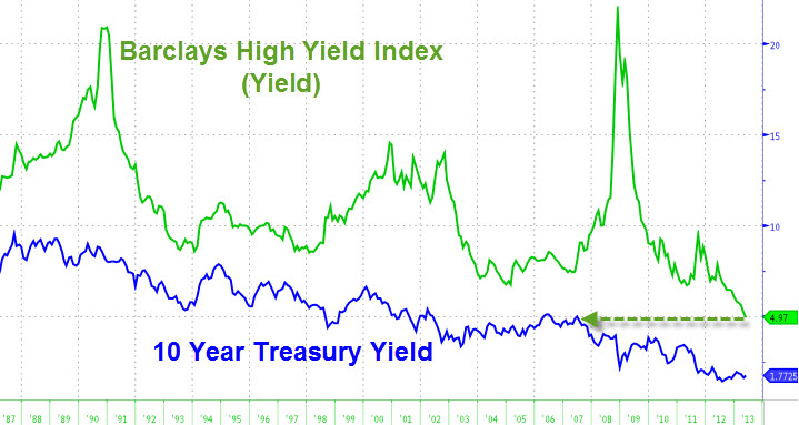 Ma si sa, il mondo è inondato di liquidità, di “stupid money” e allora – in ossequio al detto in base al quale l’appetito vien mangiando – si compra tutto, basta che paghi un buon rendimento. Ai rischi, ci si penserà domani. basti guardare questo grafico, ci dice come l’indice corporate “high yield” di Barclays sia al di sotto del 5%, lo stesso rendimento dei Treasuries statunitensi del 2007.