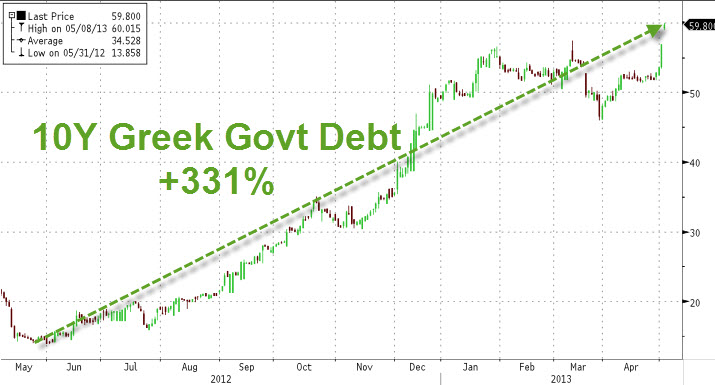 Cosa vuol dire? Che c’è talmente fame di rendimenti che ormai nel mercato obbligazionario corporate si viaggia su rendimenti inferiori al 5% per la prima volta da quando esiste l’indice: non pensiate che nell’obbligazionario sovrano le cose vadano meglio, visto che il Ruanda emette debito in dollari pagando il 7%, come la Spagna un anno fa e piazza tutta la sua carta da parati leopardata. Ancora non vi basta? Non c’è problema, ho dati e materiale per andare avanti una settimana. Guardate quest’altro grafico, ci mostra l’andamento del prezzo del nuovo bond sovrano ristrutturato greco a 10 anni: +331% in un anno.