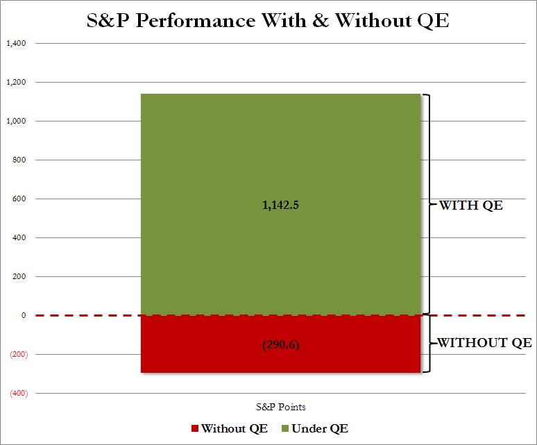 Guardate quest’ultimo grafico, ci mostra quanto ha contato il diluvio di soldi della Fed nel raggiungimento dei nuovi massimi dell’indice Standard&Poor’s della Borsa di New York. Quei soldi però non sono eterni, non si può stampare in eterno e quando finirà la pacchia quei titoli sopravvalutati dovranno fare i conti con il mark-to-market post-bolla e saranno dolori, una correzione spaventosa. Cui si potrà dare risposta con una sola cosa, l’unica opzione sempre valida per stimolare l’economia interna: una guerra. Riflettete a quanto sta accadendo, unite i puntini degli avvenimenti come nel gioco de “La settimana enigmistica” e chiedetevi se tutto è disgiunto e casuale. Oppure no.