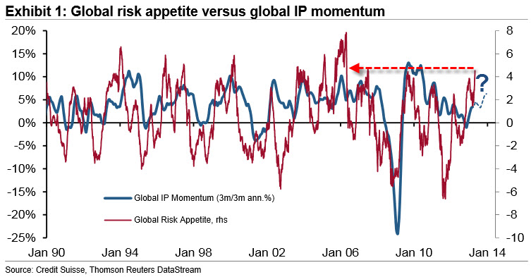 Peccato che questo clima di festa, si basi su due presupposti piuttosto inusuali. Primo, il rally dell’appetite risk non è supportato, come accade normalmente, da un momentum di crescita globale: ovvero, quando l’appetito di rischio arriva a livello di euforia, l’indicatore Global IP va ben al di sopra della sua media di lungo termine. Non è il caso attuale, visto che siamo sotto il 5%, come mostra bene questo grafico.